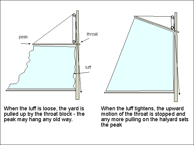 I tested this in the yard and it seemed to work fine. You haul the halyard and it pulls the throat block up towards the masthead block. Eventually, the luff (front edge of the sail) becomes tight, and the throat block can't go any higher. If you keep pulling on the halyard, the peak (end of the yard) comes up until either the peak can't be raised any more or the leech (back edge of the sail) becomes tight. |